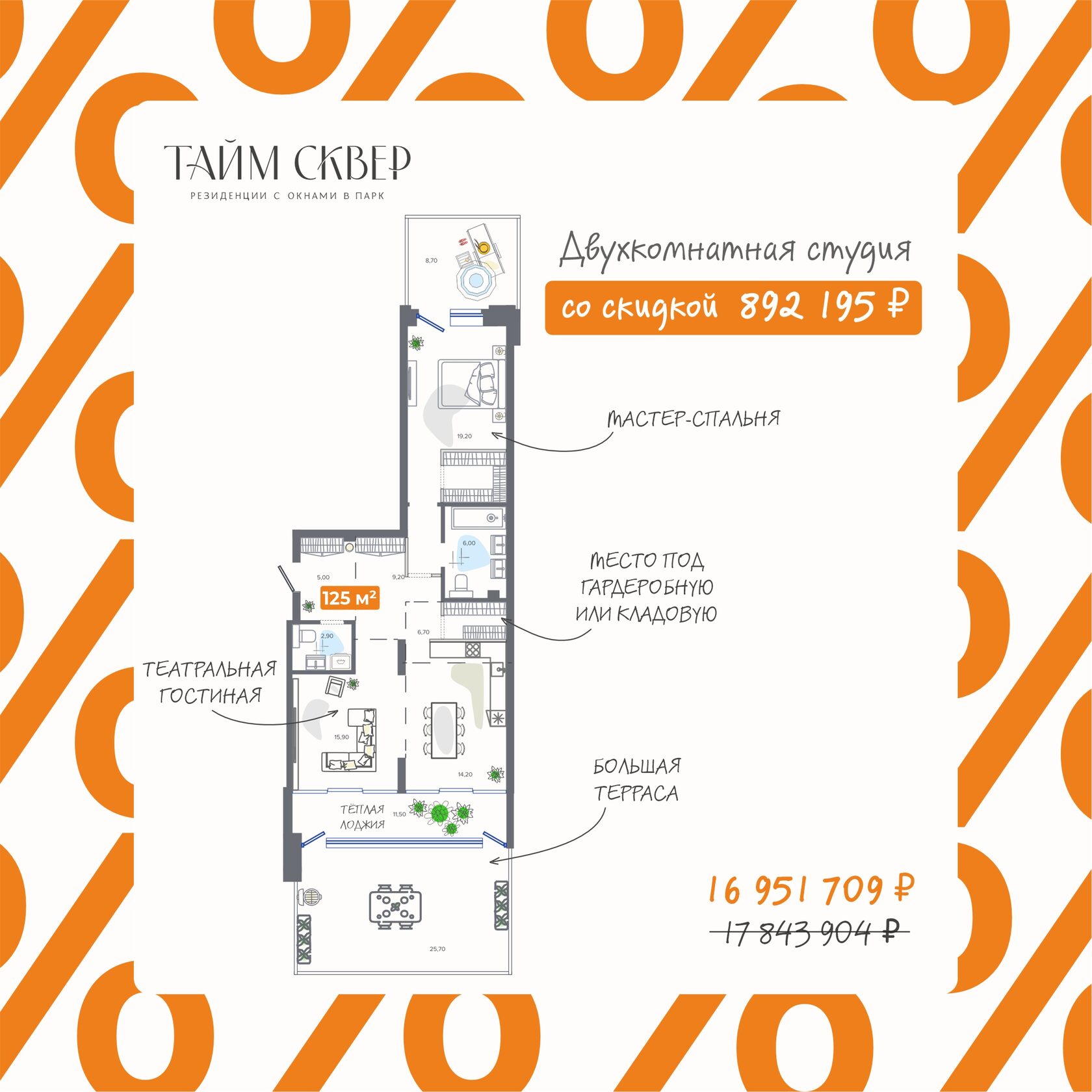 Квартира №209 на 3 этаже: 2К, 125 кв.м, скидка 887 429₽